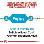 Royal Canin® German Shepherd Junior is tailor made to suit the unique nutritional needs of your German Shepherd puppy. This premium dry puppy food is formulated specifically to support the growth and development of German Shepherd puppies. Royal Canin® German Shepherd Junior is rich in antioxidants and prebiotics to support your puppys natural immune defences, and is made from highly digestible ingredients to help prevent digestive problems, flatulence and bad stool odour. It has an exclusive kibble size, shape and texture made specifically to suit the German Shepherds jaw and also has an adapted calcium and phosphorus content to support optimal bone and joint development.