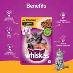 - Whiskas kitten food in Chicken and Gravy comprises of flavorful chicken chunks in an appetizing gravy packed with high-quality protein and essential nutrients.